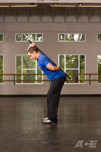 Note, the stick should be touching your pelvis as well as your upper back. This should stay the same through the entire motion. If you begin to round your back, than the stick will come off the pelvis.