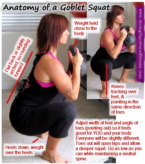 KETTLEBELL GOBLET SQUAT: similarly, if you want to add in low back and leg strengthening, as above, hold the kettlebell by the horns and maintain the same upper body alignment as you squat down and attempt to get your elbows between your knees. DO NOT LET YOUR BACK ROUND OUT!
